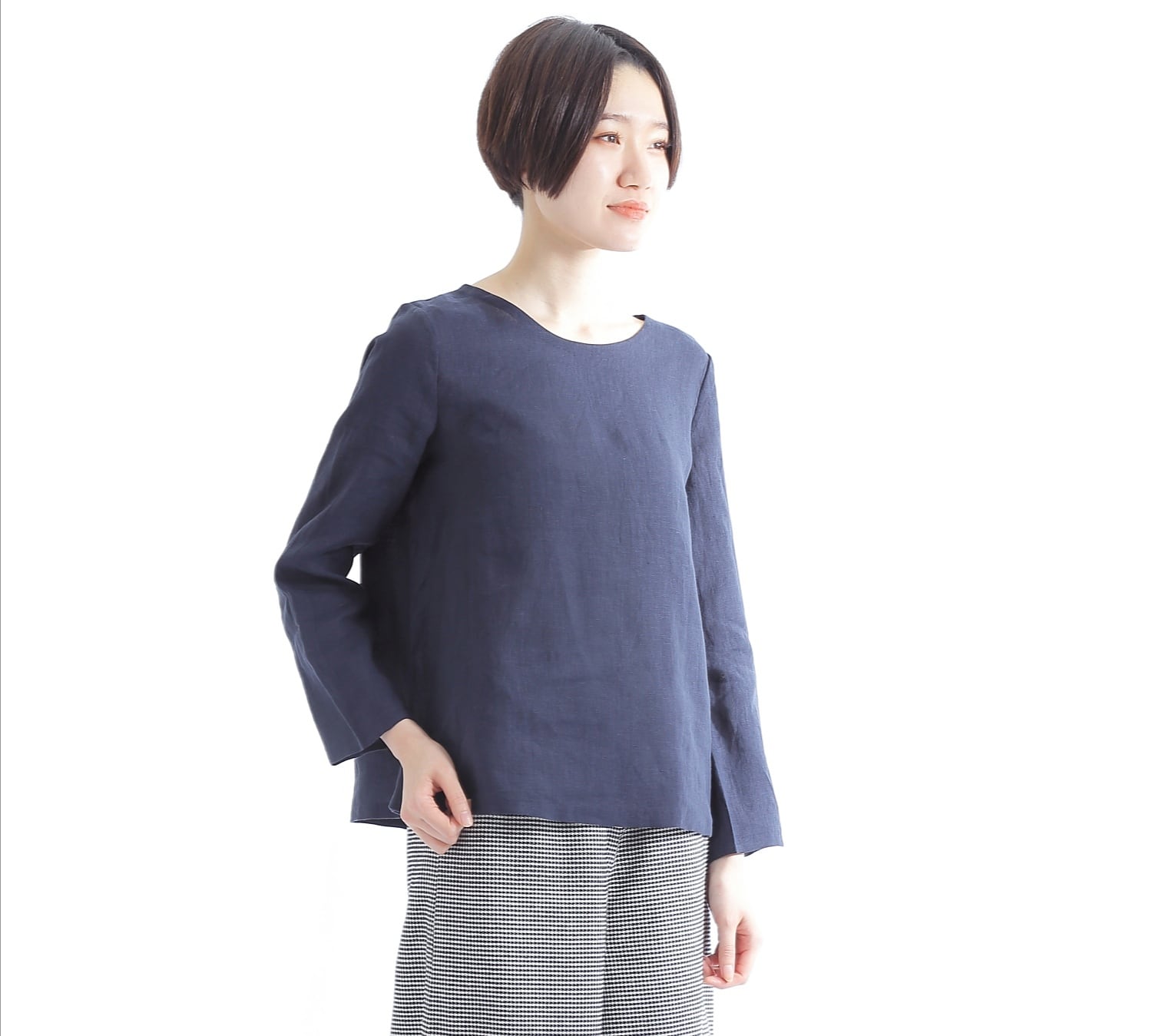ネイビーのシンプルなブラウスですので、オフィスカカジュアルやお出かけ着としても重宝するアイテムです。
